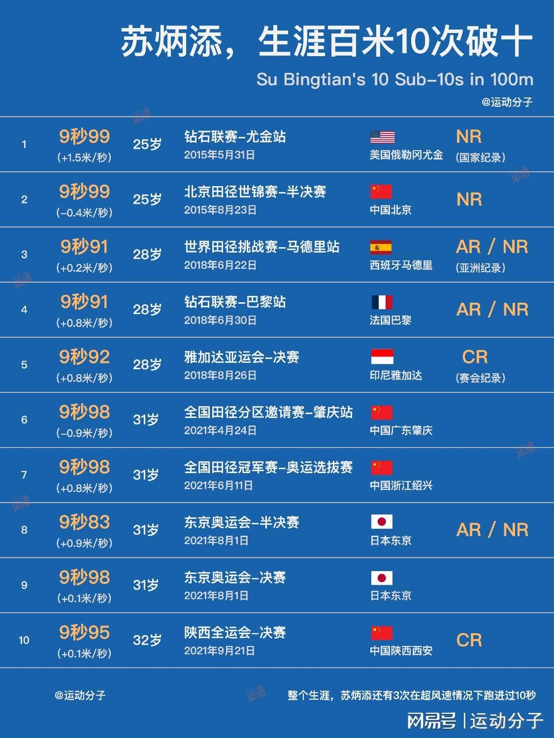 整个生涯,苏炳添合计13次100米破十。其中10次在合规风速内完成;