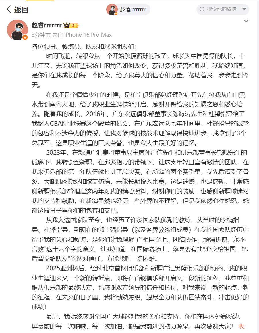 赵睿也特别感谢了新疆男篮的包容和理解:“2023年,在新疆广汇集团董事局主席孙广信先生和俱乐部董事长郭舰先生的诚邀下,我转会至新疆,在邱彪指导的带领下,让这支年轻且富有激情的团队,在我来俱乐部的第一年队伍就打进了总决赛,在新疆的两个赛季里,我先后遭受了骨裂、大腿肌肉撕裂和膝盖伤病,未能长期投入比赛,这是遗憾,也是磨砺,非常感谢新疆俱乐部管理层这两年对我的精心照料,谢谢你们的鼓励,也感谢新疆球迷对我的支持和鼓励,在新疆虽然也经历一些外界的不理解,但是我依然心存感恩,感谢这段日子里你们的包容和支持。”
